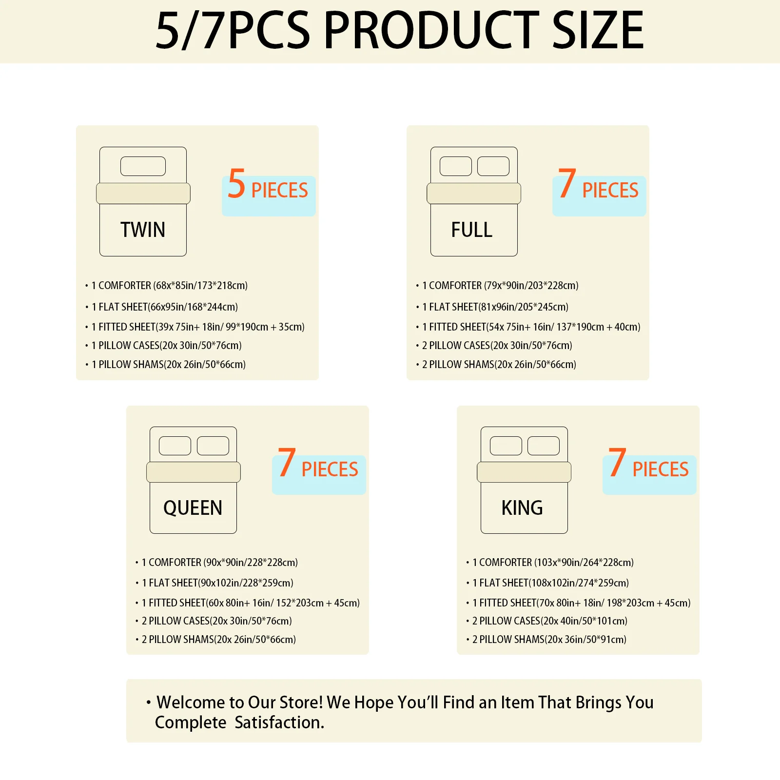 [Everything You Need]: 5/7 piece bed bag includes 1 comforter, 1 flat sheet, 1 fitted sheet, 1/2 pillow case, 1/2 pillow shams; This bed bag set is perfect for making any room your own A new look. Twin 173*218: 5 pieces, FullQueenKing: 7 pieces.