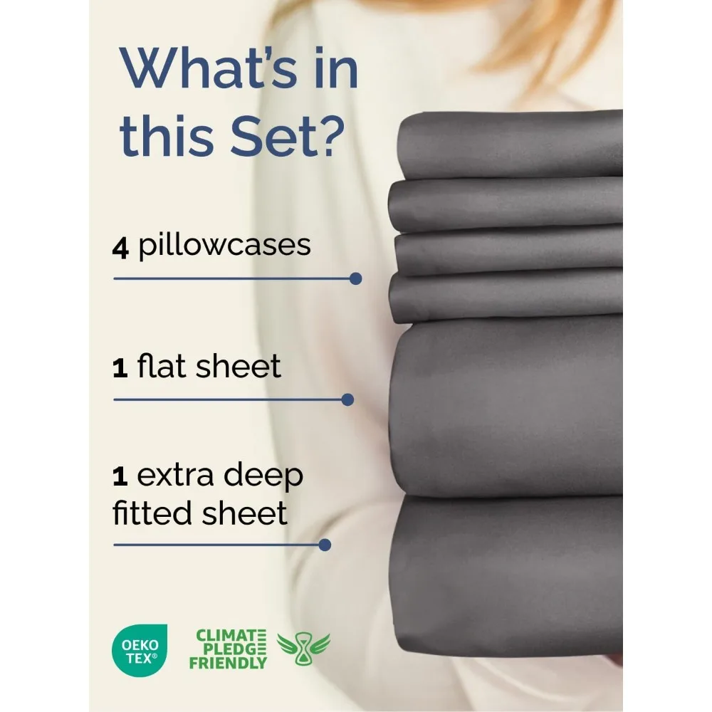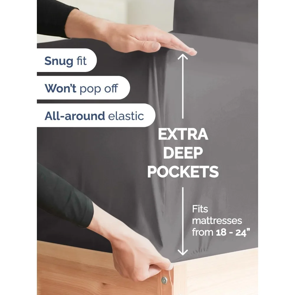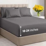 This product features extra deep pocket queen sheets designed for mattresses with deep pockets ranging from 18 to 24 inches. The fitted sheets have stretchable elastic for a snug fit around your mattress, ensuring a secure and comfortable fit for extra tall and large mattresses. The six-piece sheet set includes four pillowcases with secure enclosure designs, providing a perfect fit for your extra thick mattress and offering a soft, cozy, and breathable sleep experience. These sheets are ideal for mattresses with a double pillow top, memory foam toppers, and other large mattress pads, ensuring they stay in place without slipping off. Made from microfiber, these sheets are incredibly soft and lightweight, offering a unique feel that is softer than cotton. If you’re used to cotton sheets, these microfiber sheets provide a luxurious alternative that you might enjoy. The dimensions of the sheets are as follows: the flat sheet measures 95 inches wide and 102 inches long, while the fitted sheet is 60 inches wide and 80 inches long with 21-inch pockets that can stretch due to the elastic. Each of the four pillowcases is generously sized at 20 inches by 30 inches.